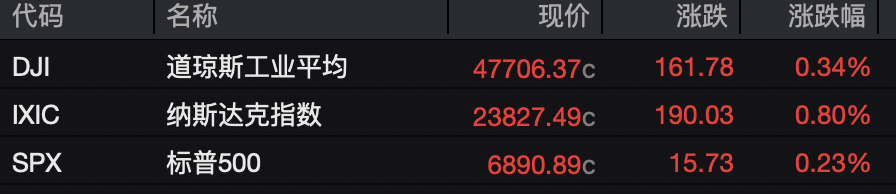 受美联储降息预期、科技巨头较好财报预期等因素的推动,当地时间周二(10月28日),美国股市三大股指全线收涨,道琼斯工业指数涨0.34%,报47706.37点,标准普尔500指数涨0.23%,报6890.89点,纳斯达克指数涨0.8%,报23827.49点,上述三大指数均续创历史新高。
