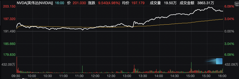 当天,英伟达股价大涨近5%,盘中一度涨超6%,总市值逼近5万亿美元。