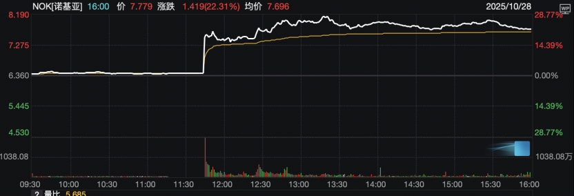 诺基亚股价更是大幅拉升,一度涨近30%,创2021年1月以来的最高水平。最终收涨超22%,总市值超400亿美元。